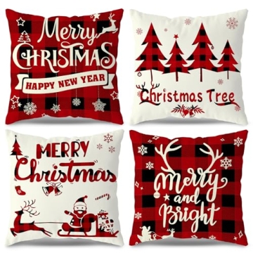 Show more Transform your home this holiday season with our **Christmas Pillow Covers**. This delightful set features four 18x18 inch covers that effortlessly blend into your seasonal decor. Adorned with a gorgeous red-black buffalo check pattern, these covers instantly add a warm, rustic charm to any space—be it your living room, sofa, or outdoor seating area. Their **durable fabric** is designed to hold up against the rigors of indoor and outdoor use, ensuring that your festive spirit shines bright year after year.