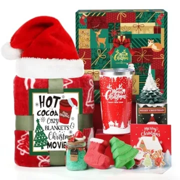 Show moreTHE PERFECT CHRISTMAS GIFTS BASKET FOR WOMEN:If you are looking for a Unique Christmas Gifts For Women Who Have Everything, the special gift sets would express more than your think She will never have a moment experience such feeling cherished, cared and respected, and this Xmas gift box you prepared for her will to be the One of the most unforgettable memories in her life IMPRESSIVE GIFTS FOR ANYONE : Give her this perfect Christmas gift set for women, It makes a perfect Xmas gift for your women, mom, grandma, sister, best friends, wife,lover and all. Also a Unique Christmas present for teacher coworker boss nurse teacher coworker neighbor...This luxury spa gift basket for women will make her smile and think of you PERFECT CHRISTMAS GIFT BOX FOR HER: The Christmas gifts includes: the 20oz stainless steel tumbler with the words "Merry Christmas and happy new year"-think of you while enjoying favorite drink; Blanket with Christmas elements and Christmas wishes-let her enjoy the Christmas holiday with love; the Christmas tree shaped Scented Candles is made from essential flower oil and 100% soy wax; Christmas Santa Hat UNIQUE CHRISTMAS GIFTS FOR WOMEN: Every item in our gift box is made of high quality materials, this gift basket has been carefully curated, It will surprise that woman in a special christmas gifts. the Christmas Bath Bomb will make her enjoy a luxurious and sublime home spa experience; the Christmas greeting card is included to write your blessing message freely ALL OCCASION GIFTS FOR WOMEN: Our Christmas aromatherapy gift sets are carefully selected. This is the perfect gift for her birthday, wedding, anniversary, retirement, graduation, Christmas, Mother's Day, Valentine's Day and Thanksgiving. Whether you are looking for a gift for your best friend, mom, sister, grandmother, girlfriend, bridesmaid, wife, nurse, teacher, daughter, aunt, colleague - this Christmas gift basket is the perfect choice. Less