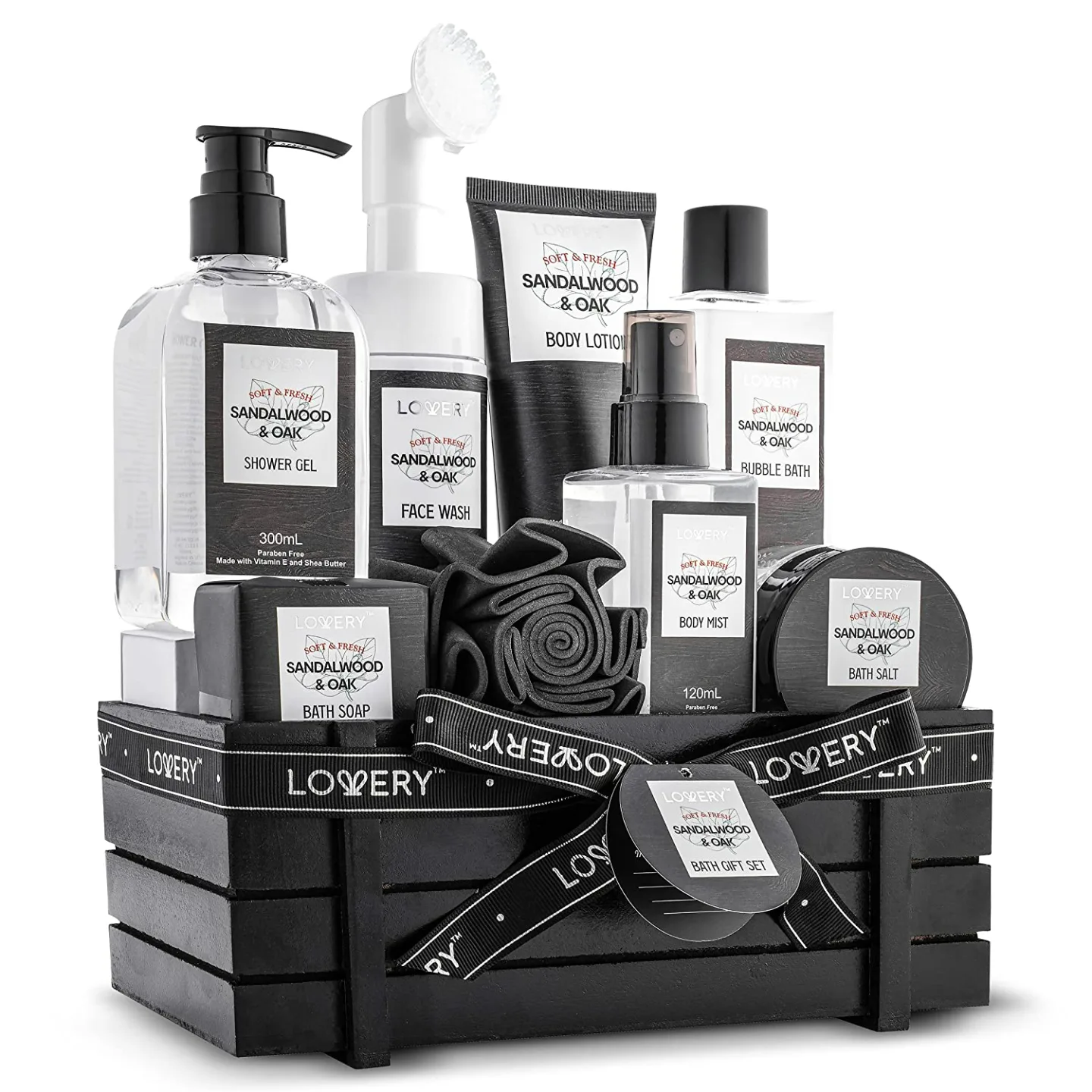 Unlike other generic spa sets usually geared towards women, the Lovery Men's Spa Kit stands out with its masculine scent profile of sandalwood and oak, specifically selected to appeal to men. Additionally, the inclusion of a rustic wooden basket for presentation not only enhances the aesthetic but also adds a unique touch compared to the common plastic packaging of similar products.