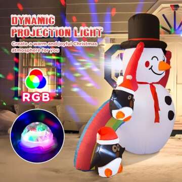 Bring your holiday spirit to life with the Christmas Inflatable Snowman featuring a Dynamic Projection Light! This enchanting 6FT inflatable captures the essence of Christmas with its charming design that includes a dazzling snowman complete with a top hat, delightful penguin companions, and a vibrant rainbow slide. Perfectly sized for any yard or garden, this inflatable not only serves as an eye-catching decoration but also creates a joyful atmosphere with its colorful lights...