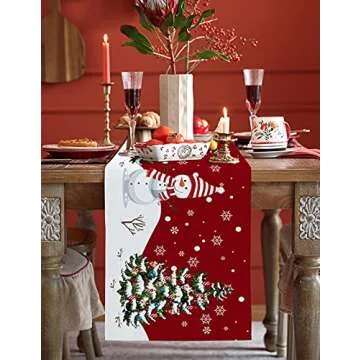Show moreTransform your dining experience this holiday season with our stunning Christmas Table Runner. Crafted from a durable cotton and linen blend, this table runner combines elegance and functionality, providing a beautiful and festive touch to your dining room. Available in a vibrant Christmas red adorned with charming snowman and snowflake patterns, it instantly enhances your decor while protecting your table from scratches and spills. Measuring 13 x 36 inches, it fits most tables, making it the perfect accessory for your holiday gatherings or everyday meals.