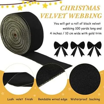 Show moreTransform your holiday decorations with our exquisite Christmas Wired Velvet Ribbon with Gold Edge! This stunning velvet ribbon captures the essence of Christmas with its rich vibrancy, making it the perfect choice for anyone looking to elevate their festive decor. The luxurious black velvet is paired with a sophisticated gold edge that not only enhances your wreaths and bows but also adds a touch of elegance to any project. With a generous 100 yards of 4-inch wide ribbon, you have ample material to unleash your creativity for both indoor and outdoor decorations.