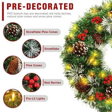 Show more Introducing the exquisite **Christmas Wreath**, a beautifully crafted, pre-lit artificial wreath that perfectly captures the spirit of the holiday season. Measuring a generous 18 inches, this charming decoration is composed of lush snowflake pine needle branches, adorned with two types of pine cones and vibrant berry clusters, along with 80 individually crafted branch tips. Each element of this wreath has been designed to mimic the natural beauty of a fresh wreath, ensuring it adds a touch of seasonal elegance to your décor. More than just a stunning visual centerpiece, this wreath boasts **50 battery-powered LED lights**, creating a mesmerizing glow that will illuminate any space. With **8 adjustable modes** for brightness, you can customize the ambiance to fit your festive mood. This wreath is not only about beauty; its fire-resistant and non-allergenic materials guarantee lasting durability, making it a wonderful addition to your holiday celebrations for years to come.