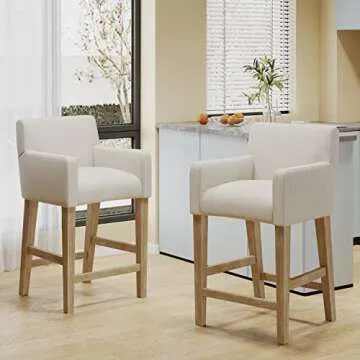 Show more Introducing our elegantly designed Counter Stool Set, a perfect blend of comfort and contemporary style that will elevate any living space. With rounded armrests and a classic H-frame base, these stools exude a minimalist charm that is both stylish and functional. The stools are generously upholstered, providing a soft and refined appearance that complements a variety of decors. Crafted with a sturdy **rubberwood frame**, these stools boast a beautiful natural grain finish, ensuring both durability and aesthetic appeal.