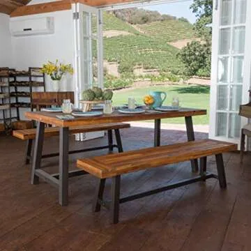 Add a perfect focal point to your outdoor space with this casual Acacia wooden picnic table set. The Bowman table and benches are each complete with a folding steel frame that accentuates the sandblasted finish to offer a raw yet refined edge to any arrangement
