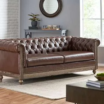 Show moreIntroducing the **Christopher Knight Home Castalia Sofa**, an elegant piece that seamlessly blends traditional design with modern sophistication. With its **Chesterfield-inspired** silhouette, this three-seater sofa features smooth upholstery complemented by deep button tufting, creating a striking visual appeal. The classic scrolled tuxedo arms and turned legs add an exquisite touch reminiscent of timeless elegance, while the rich **dark brown** color harmonizes beautifully with any home decor. Due to its classic design and quality craftsmanship, this sofa promises to elevate your living space while providing comfort and style.
