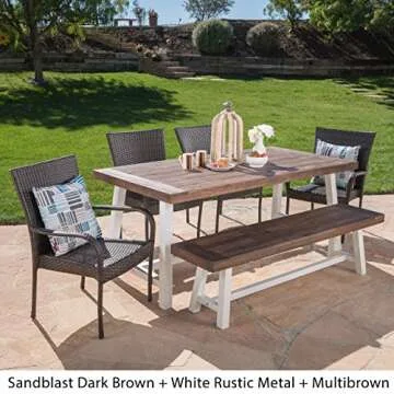 Show more Transform your outdoor dining experience with the Christopher Knight Home Cooper Outdoor Stacking Wicker Dining Set. This impeccably designed dining set includes a sturdy Acacia wood table, a sleek bench, and four comfortable wicker dining chairs, effortlessly accommodating up to six people. Perfect for gatherings, family meals, or serene evenings under the stars, this set beautifully blends functionality and style.