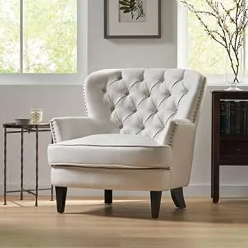 Show moreIntroducing the Christopher Knight Home Alfred Button-Tufted Fabric Club Chair—a perfect blend of style and comfort for your living space. This elegant chair, upholstered in soft ivory fabric, radiates sophistication with its stud accents and classic button-tufted design. The chair's plush padding offers optimal support, making it an ideal spot for relaxation whether you are curling up with a book or entertaining guests. Its sturdy frame and durable construction ensure this piece remains a delightful center of attention in your home for years to come.