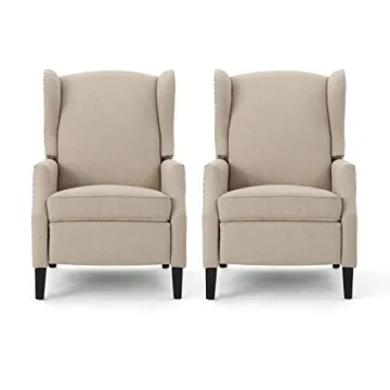 Show moreIntroducing the Christopher Knight Home Ellyn Fabric Recliner Set, designed for those who appreciate style and comfort without sacrificing valuable space in their home. The perfect blend of contemporary aesthetics and functionality, this luxurious set of two recliners comes in a chic Wheat fabric complemented by Dark Brown wooden legs. Not only do these chairs serve as a seating option, but they elevate your living space with their sleek modern design. Crafted with smooth upholstery and elegant tonal piping, they are indeed a statement piece that turns heads while you unwind after a long day.