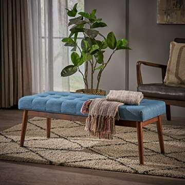 Show moreIntroducing the **Christopher Knight Home Flavel Mid-Century Tufted Fabric Ottoman** – your new favorite addition to any living space. This stunning ottoman combines elegance and functionality, showcasing a stylish design that effortlessly complements both modern and traditional interiors. With its rich blue fabric and walnut-finished rubberwood legs, this ottoman not only serves as a chic accent piece but is also tailored for everyday practical use. Measuring 44 inches wide and 17.25 inches deep, it provides ample surface area for resting your feet or can be cleverly utilized as extra seating when hosting friends and family. The handcrafted details and sturdy construction ensure this piece will remain a staple in your home for years to come.
