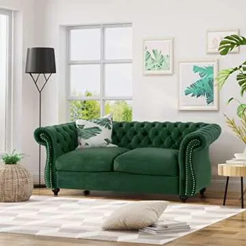 Show more Introducing the Christopher Knight Home Karen Traditional Chesterfield Loveseat Sofa, a stunning fusion of timeless design and contemporary elegance. This meticulously crafted loveseat is more than just furniture; it’s a stunning centerpiece that redefines your living space. Enveloped in a rich emerald polyester fabric, it features traditional rolled arms and intricate tufting that whisper sophistication while the beautifully turned legs add a grounding element to its aesthetic appeal. The expertly placed nail head accents create a sense of grandeur, ensuring it captures attention in any setting.