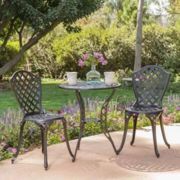 Show moreTransform your outdoor space into a charming Parisian café with the Christopher Knight Home La Sola Metal Outdoor Bistro Set. Perfectly designed for cozy gatherings, brunches, or quiet moments with your favorite book, this elegant bistro set merges style and functionality. Featuring a classic black finish accented with bronze, it adds a sophisticated touch to any patio, balcony, or garden. Manufactured with quality in mind, it strikes the perfect balance of sturdiness and lightness, allowing for easy rearrangement without compromising on durability. Ideal for small spaces, it promises to enhance your outdoor experience while inviting relaxation and enjoyment.