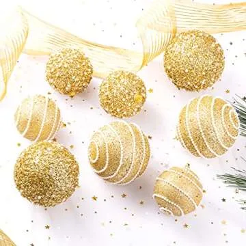 Show more Step into a winter wonderland with the ChrisWish Gold Christmas Ball Ornaments, designed to add a touch of glitz and glamour to your holiday decor. Each ornament in this exquisite 12-piece set boasts a delightful combination of sparkling pearls and shimmering sequins, providing a stunning visual that will elevate the festive spirit of any space. Constructed from high-quality shatterproof plastic, these ornaments are not only beautiful but also durable, ensuring they stand the test of time and add joy to Christmas celebrations for years to come.