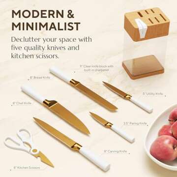The elegance of the set is underscored by its captivating white and gold aesthetics, which blend seamlessly with your kitchen decor. The clear display block not only protects your knives but also transforms them into a stunning showcase, making a statement that emphasizes sophistication and style. Plus, cleanup is simplified with the included cleaning wipe, ensuring your knives remain as dazzling as the day you bought them, without detracting from your culinary adventures.