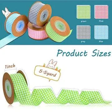 The vibrant colors of green, pink, blue, and gray evoke the essence of spring and celebrate occasions such as Easter. Specially designed for DIY enthusiasts, each roll measures **1 inch in width** and has a generous length of **5 meters**, providing a total of **20 meters** of ribbon to spark your creativity. The capability to cut the ribbons to your desired lengths ensures that you're always outfitted for the moment, transforming ordinary items into extraordinary expressions of creativity.