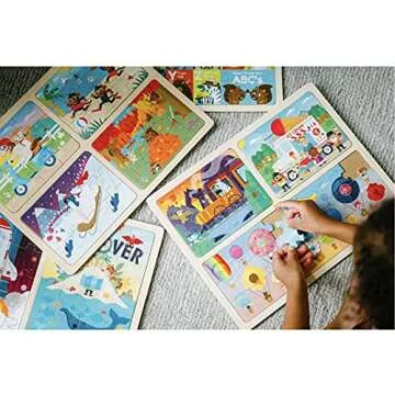 The puzzles feature themes such as the Alphabet, Animals, and Seasons, which promote learning!
