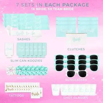 Our 56-piece bachelorette party favors set packs an exciting array of accessories, including matching sashes for the bride and bridesmaids, chic hair ties, practical sunglasses, cozy can koozies, stylish makeup bags, robust shot glasses, and fun temporary tattoos. Each item is selected to contribute to an atmosphere of celebration and joy, ensuring that everyone can enjoy a memorable evening.