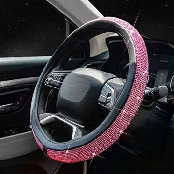 ChuLian New Diamond Leather Steering Wheel Cover with Bling Bling Crystal Rhinestones, Universal Fit 15 Inch Car Wheel Protector for Women Girls Pink Diamond