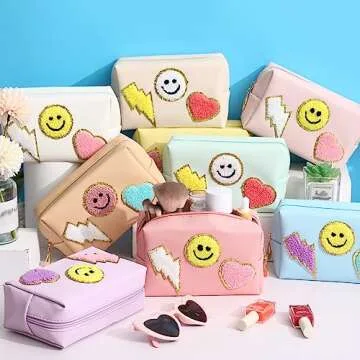 Show moreIntroducing the Chunful 9 Pieces Preppy Patch Makeup Bag Set – a delightful collection of cosmetic bags designed to blend style with functionality. Crafted from high-quality PU leather, these bags are not only lightweight and easy to clean but also waterproof, ensuring that your personal items stay safe and dry. Each bag features vibrant patches, including gold glitter letters, smiles, hearts, and lightning motifs, adding a touch of charm to your daily routine. Perfect for anyone who appreciates cute, practical accessories.