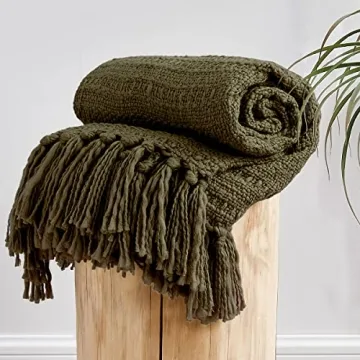 Show more Introducing the **Chunky Knit Throw Blanket** by HORIMOTE HOME, where practicality meets luxurious comfort! Crafted from high-quality **1.76 lbs acrylic**, this gorgeous olive green throw blanket is as soft as it is stylish, providing warmth whether you’re snuggling on the sofa, cuddled up in bed, or enjoying a cozy evening around the campfire. Measuring **50"x60"**, it’s the perfect size to wrap yourself in comfort without overwhelming your living space. The unique textured basket woven pattern, complemented by chic knotted tassels, adds a touch of bohemian charm to any room, making it a delightful addition to your home decor.