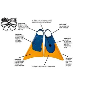 Show more Introducing the Churchill Floating Swimfins, a revolutionary pair of swim fins that have set the standard for aquatic performance since 1936! With their innovative dolphin fin design, these fins offer unparalleled thrust and maneuverability in the water, making them ideal for swimming, snorkeling, bodyboarding, and scuba diving. Crafted from high-quality natural gum rubber, these fins are not only durable but also naturally buoyant, allowing you to float effortlessly as you glide through the waves.