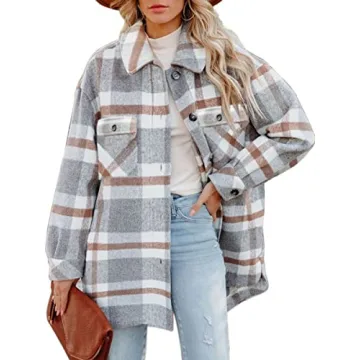 Show moreDiscover the ultimate in casual chic with the CHYRII Women's Casual Brushed Flannel Plaid Shacket. This beautifully designed jacket is crafted from a premium polyester fabric that feels luxuriously soft against the skin, mimicking the comfort of wool. Designed for both warmth and breathability, this shacket features a classic plaid pattern, a button-down front, and a stylish turn-down collar, making it a versatile piece for any wardrobe. Perfectly tailored for a relaxed boyfriend fit, it boasts two convenient chest pockets, long sleeves with button closure cuffs, and a lightweight construction that is perfect for layering. Available in a chic grey color, it's an effortless addition to your outfit for any occasion.