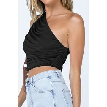 CHYRII Women's Sexy Sleeveless Crop Tops - One Shoulder Ruched Tank in Black