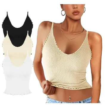 CHYRII Womens 3 Pack Ruffled V Neck Cropped Tops Workout Basic Ribbed Camisole Tank Tops Black + White + Beige S