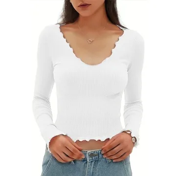 CHYRII Womens Fashion Fall Long Sleeve Tops Ruffled Low Cut Basic Layering Tee Shirts Crop Tops White S