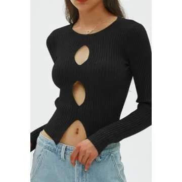 Show more This sexy fashion sweater is the ultimate wardrobe staple for any confident woman looking to express her style. Featuring a trendy round neckline and long sleeves, this pullover boasts two alluring keyhole cutouts at the front, instantly elevating the allure of your look. The daring slit at the front hemline adds a playful hint of midriff, making it a perfect choice for those who want to embrace their inner diva and showcase the latest Y2K fashion trends.