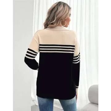 CiCiBird Women Fall V Neck Sweater Color Block Polo Long Sleeve Shirt Casual Loose Striped Pullover Sweaters Apricot Black L
