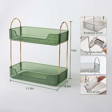 Show moreIntroducing the CICUFY Bathroom Counter Organizer — a sophisticated double-tier vanity tray designed to transform your bathroom into a clutter-free oasis. With its elegant leaf green finish, this organizer not only enhances your bathroom's aesthetic but also makes the most of your countertop space. Its thoughtful double-layer structure provides ample room to accommodate all your beauty essentials, from lotions and perfumes to cosmetic tools, maintaining a neat and tidy environment.