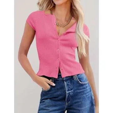 Cicy Bell Womens Cap Sleeve Crop Tops Fitted Button Down V Neck Shirts Y2k Going Out Cute Ribbed Knit Tshirts Pink