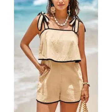 Show more Discover the perfect blend of style and comfort with the Cicy Bell Womens Casual Sleeveless Romper. Crafted from premium quality 100% cotton fabric, this romper promises a breathable and soft-to-wear experience that makes it an ideal choice for almost any occasion. Featuring an adjustable tie shoulder for a customized fit, a chic contrast trim, and an elastic waist that accentuates your silhouette, this romper is designed to flatter every body type. The charming ruffle hem adds a playful vibe that is both youthful and fun, while the loose fit ensures all-day comfort, making it your go-to outfit for sunny days.