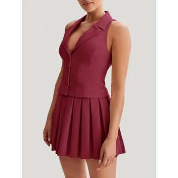 Show more Introducing the Cicy Bell Women’s Summer 2 Piece Outfits — the quintessential addition to your summer wardrobe that effortlessly combines style and sophistication. This stunning ensemble features a chic deep V-neck blazer vest adorned with functional front buttons and a stylish lapel collar, perfectly paired with a high-waisted mini pleated skirt. Available in a rich burgundy hue, this outfit ensures that you stand out beautifully while maintaining an air of elegance no matter where you go.