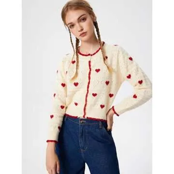 CIDER Women's Cardigan Crew Neck Heart Print Color Block Button Down Crop Top Long Sleeve Cute Cardigan: Ivory, M