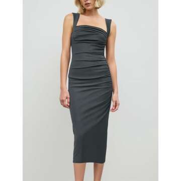 Show moreIntroducing the CIDER Women's Summer Dresses 2024 - a stunning blend of elegance and comfort. This solid square neck ruched sleeveless midi dress in a chic grey is designed to flatter all body types with its graceful contours and form-fitting silhouette. Made with a high-quality mix of polyester and elastane, it ensures you not only look fabulous but also feel free to move. The ruched design hugs your curves, providing a flattering fit that enhances your natural figure without sacrificing comfort, making this dress a must-have for your summer wardrobe.