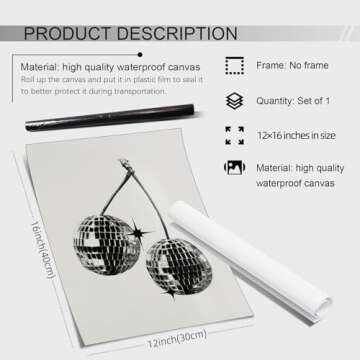 Show moreTransform your living space with the CIDLNMY Retro Disco Art Poster! This stunning black and white canvas wall art is not just a decorative piece, but a splash of vibrant culture that brings together nostalgia, fashion, and fun all in one striking design. Measuring 12x16 inches, this unframed print features an artistic representation of a classic disco ball, perfect for adding a trendy touch to your apartment or living room. Crafted with high-quality materials, it promises durability while maintaining its striking aesthetic appeal.