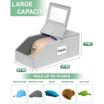 Show moreIntroducing the Cigorea Hat Organizer for Baseball Caps – a must-have storage solution designed for hat enthusiasts who crave organization and style! This sleek and functional storage box set offers a total capacity to hold up to 26 caps (13 in each box), making it the ultimate answer to managing your headgear clutter. Say goodbye to disorganized shelves and worn-out hats, and hello to a pristine, dust-free collection that showcases your favorite caps perfectly. With dimensions of 17" D x 8.7" W x 7" H, these boxes are perfectly sized to fit snugly in your closet, on a shelf, or in your car trunk, ensuring your hats are always in excellent condition.