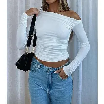 Cioatin Women Asymmetrical Pleat Ruched Off Shoulder Long Sleeve Crop Top Y2K Slim Fit T-Shirt Fall Tee Going Out Shirt White