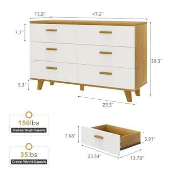CIPACHO White Dresser for Bedroom,48'' Modern 6 Drawer Dresser with Deep Drawer,Wide Wood Dresser & Chest of Drawer with Solid Handle & Leg,2 Mixed Colors Design