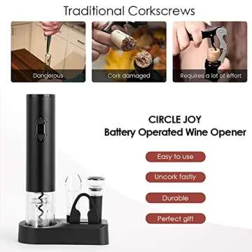 Introducing the CIRCLE JOY Electric Wine Openers Set, the ultimate gadget designed to elevate your wine experience! This state-of-the-art electric corkscrew blends modern technology with user-friendly functionality, allowing you to open your favorite bottles effortlessly. Whether you're hosting a dinner party or winding down after a long day, this opener makes vino enjoyment quick and hassle-free.