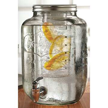 Show moreIntroducing the Circleware Sun Tea Mason Jar Beverage Dispenser, a beautifully designed beverage dispenser that combines elegance with functionality. This stunning piece is constructed from high-quality glass, measuring 12 inches tall and 7 inches wide, making it perfect for any gathering or celebration. With a generous capacity of 2 gallons, it's ideal for serving refreshing drinks to friends and family during summer parties, BBQs, or casual get-togethers. The dispenser features a convenient metal lid, a fruit infuser, and a magnificent ice insert to ensure your beverages stay cold for hours. The design is not only stylish but also practical, offering an easy-to-use spout that allows you to pour drinks with ease. Whether you're infusing water with fresh fruits or serving iced tea, this dispenser caters to all your beverage needs in an aesthetically pleasing way.