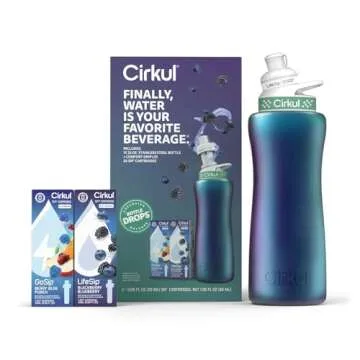 Cirkul 32oz. Chameleon Stainless Steel Water Bottle Starter Kit with Green Lid, 2 Flavor Cartridges (1 LifeSip Blackberry Blueberry, 1 GoSip Berry Blue Punch) Zero Calories and No Sugar