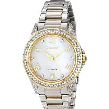 Show moreIntroducing the Citizen Women's Eco-Drive Dress Classic Crystal Watch in Two-tone Stainless Steel with a Mother of Pearl Dial (Model: EM0234-59D). This exquisite timepiece marries elegance and functionality effortlessly. With a pristine mother-of-pearl face that subtly shifts shades in natural light, surrounded by Swarovski crystals that provide a sparkling hint of glimmer, this watch is truly a sight to behold. The watch's 34mm case offers a modern 'boyfriend' look while still being perfectly proportioned for smaller wrists, ensuring a comfortable fit thanks to its smooth and flexible bracelet. Furthermore, the Eco-Drive technology harnesses the power of light, ensuring you never need to worry about battery replacements.