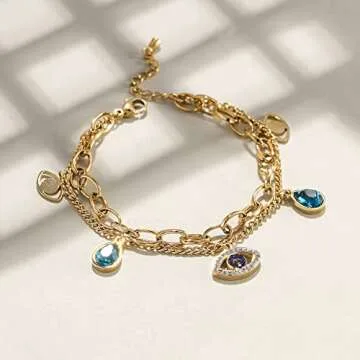 Show more Embrace stylish protection with the CIUNOFOR 14K Gold Filled Evil Eye Bracelet, a chic accessory that seamlessly blends cultural symbolism with modern design. This beautiful bracelet features a striking blue and white eye-shaped charm, intricately crafted from high-quality materials to ensure durability and long-lasting elegance. The design draws upon centuries-old beliefs that the Evil Eye can effectively shield its wearer from envy and misfortune, making it not just a fashion statement, but a meaningful talisman that resonates with many. Embrace the duality of style and purpose, as this bracelet easily pairs with both casual and formal attire.