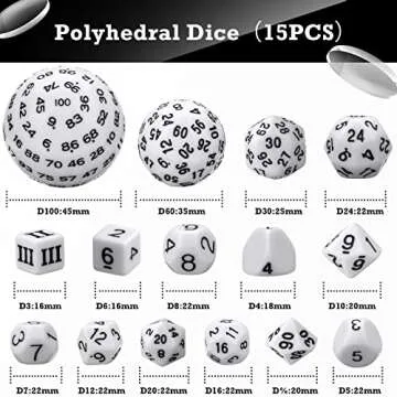 Show more Discover the ultimate dice set that elevates your gaming experience to new heights! Our abundant 15-piece polyhedral dice set features a captivating selection, including D3, D4, D5, D6, D7, D8, D10, D12, D16, D20, D24, D60, and D100. Crafted with precision, these dice meet all your gaming needs whether you're immersed in a fantasy world or embarking on a sci-fi adventure. Each die showcases a classic color scheme with a white background and bold black fonts that ensure each number is clear and easy to read.