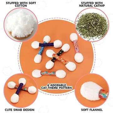 Show more Introducing the CiyvoLyeen 6Pcs Swabs Catnip Toys, the ultimate playtime companion for your feline friends! Specially designed with your cat's playful nature in mind, these adorable soft cat toys come filled with catnip, providing endless hours of fun and engagement for your pets. Crafted from high-quality, soft cotton fabric, these plush toys ensure durability and comfort, allowing your furry companions to toss, hug, and even curl up to sleep with them. Watch as they engage with these colorful, interactive toys, perfect for promoting exercise and mental stimulation!