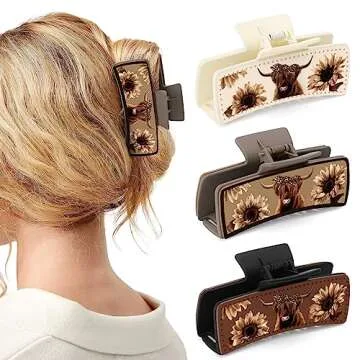 CiyvoLyeen Highland Cattle Hair Claw Clips 4" Large Hairpins for Women Matte Leather Floral Scottish Cow Long Thick Hair Neutral Colors Appreciation Gifts Idea Teacher Nurse Mom Friends Teens 3PCS