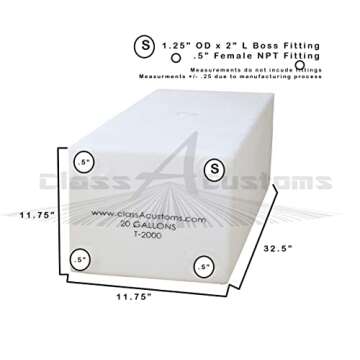 Show moreIntroducing the Class A Customs T-2000-SP, a premium 20 Gallon RV Fresh and Gray Water Holding Tank designed for versatility and reliability. Crafted with NSF-approved materials, this tank is not just safe for storing fresh and drinking water, but also efficient for gray water storage. Manufactured in Elkhart, Indiana, each tank undergoes rigorous cleaning processes to ensure it’s free from any manufacturing debris, making it a trusted choice for your portable water needs.